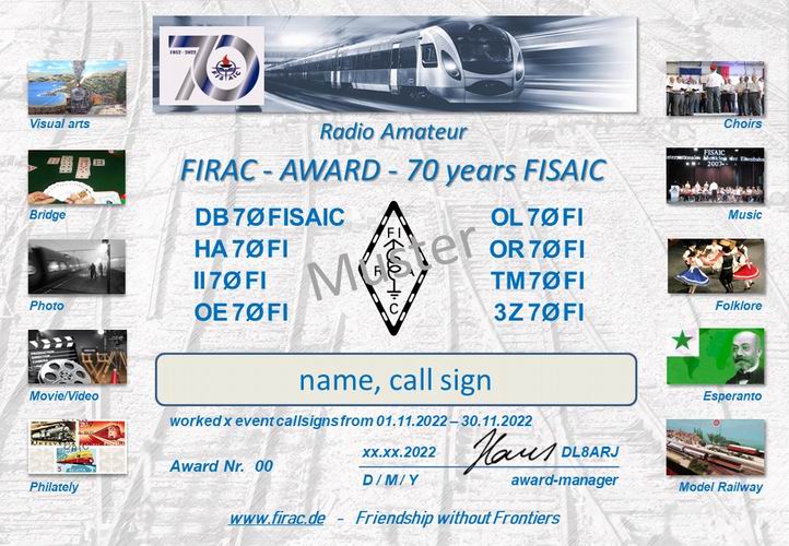 Anlässlich des 70jährigen Bestehens der FISAIC (Fédération Internationale des Sociétés Artistiques et Intellectuelles de Cheminots) als Heimat der Kulturvereine der Eisenbahner verleiht die internationale Vereinigung der Eisenbahn-Funkamateure FIRAC (Fédération Internationale des Radio Amateurs Cheminots) dieses Award an alle Funkamateure und SWLs für Funkverbindungen mit den 8 Sonderstationen im Zeitraum vom 01.11.-30.11.2022.